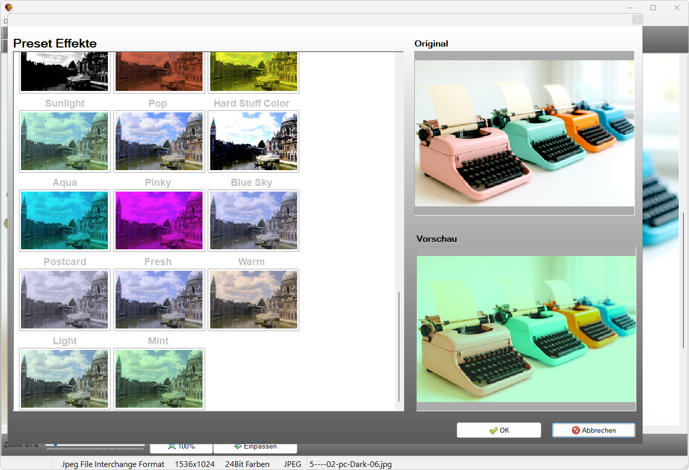 Auszug der Effekte im Bildbearbeitungsprogramm für PC