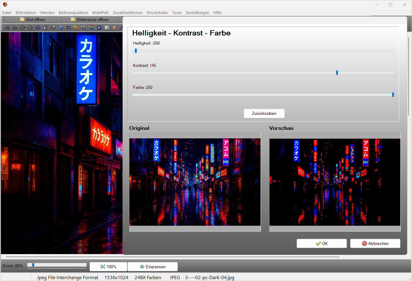 - Optimierung in Echtzeit: Kontrast, Helligkeit, Farbton und Sättigung können direkt angepasst und sofort betrachtet werden.