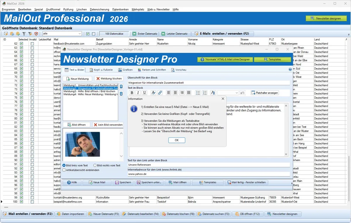 Mit der Zusatzsoftware "NewsletterDesigner Pro" können professionelle Newslettermails selbst designet werden.