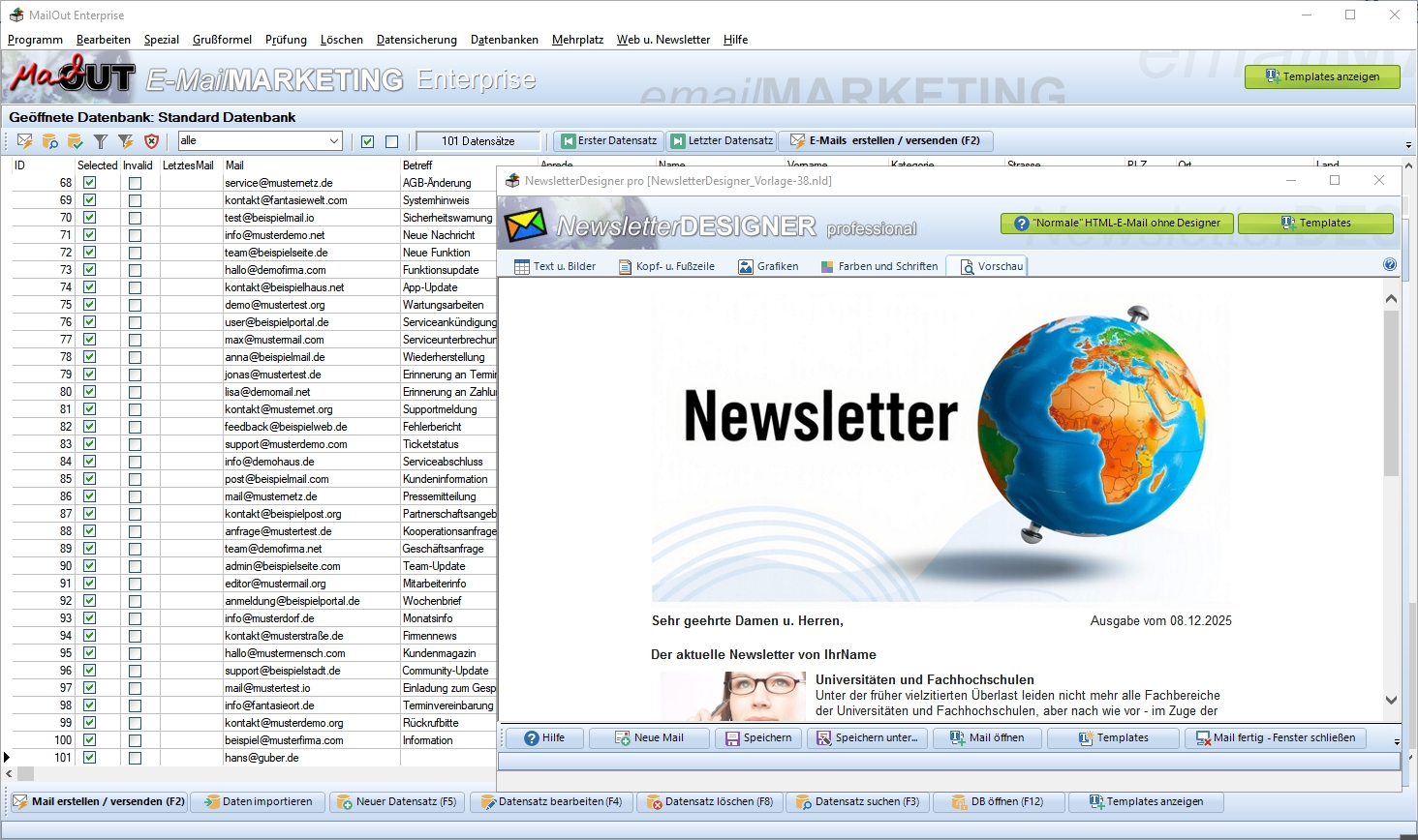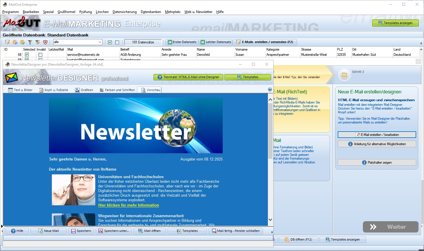 MailOut Professional ist eine deutsche Email Newsletter Software "Made in Germany" für professionelles E-Mail-Marketing. Die Software eignet sich besonders für den Versand großer Empfängerlisten, bietet detaillierte Statistiken, einen flexiblen Vorlageneditor und erfüllt umfassend die DSGVO-Anforderungen. Wird häufig in Unternehmen, Organisationen und Verbänden eingesetzt.